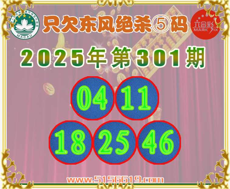 301期:〖只欠东风〗 ✌️绝杀⑤码✌️【04.11.18.25.46】开:牛05准上榜高手